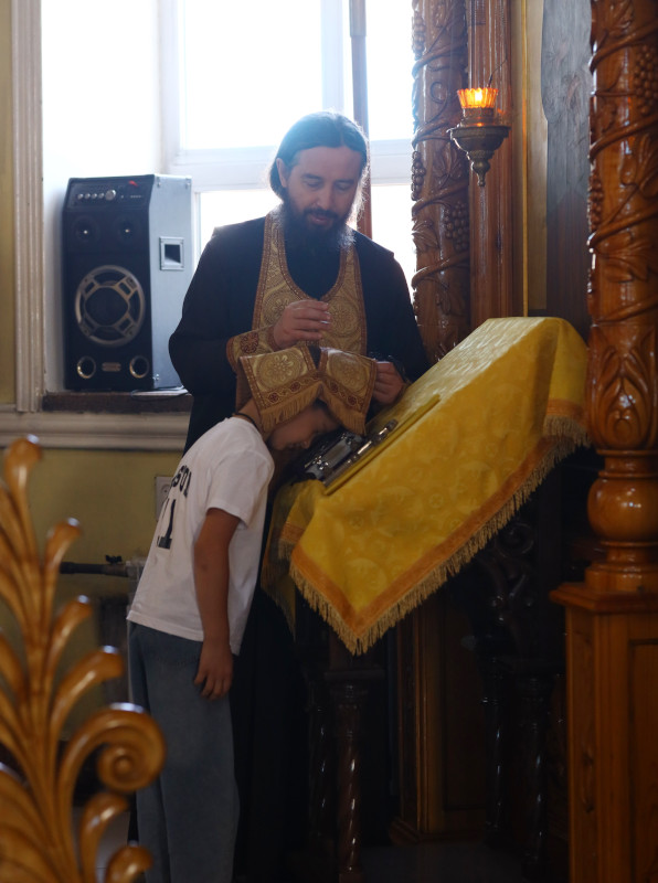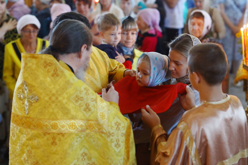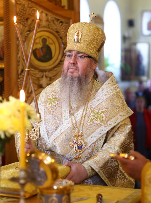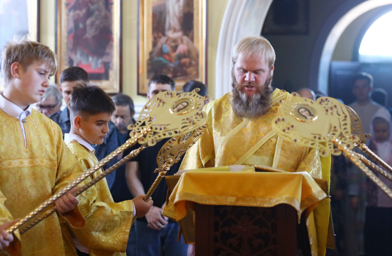 На Литургии было прочитано Евангельское повествование Зачало 58 от Матфея: И выйдя на берег, увидел Он множество народа, и сжалился над ними, и исцелил их больных. Когда же наступил вечер, приблизились к Нему ученики, говоря: «Место здесь пустынное, а час уже поздний; отпусти народ, пусть пойдут в села и купят себе еды». А Иисус сказал им: «Им нет нужды уходить; дайте вы им поесть». Они же говорят Ему: «У нас здесь ничего нет, только пять хлебов и две рыбы». Но Он сказал: «Несите Мне их сюда!» И повелев людям возлечь на траве, взяв в руки пять хлебов и воззрев на небо, произнес Он благословение, преломил хлебы и дал ученикам, а ученики — народу. И ели все, и насытились, и набрали оставшихся кусков двенадцать полных корзин. А всего едоков было пять тысяч мужчин, не считая женщин и детей. И тотчас заставил Он учеников войти в лодку и плыть на другую сторону, не дожидаясь, пока Он отпустит народ. (Мф. 14:14-22)