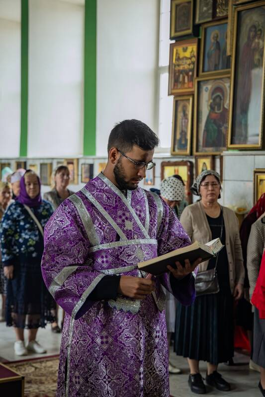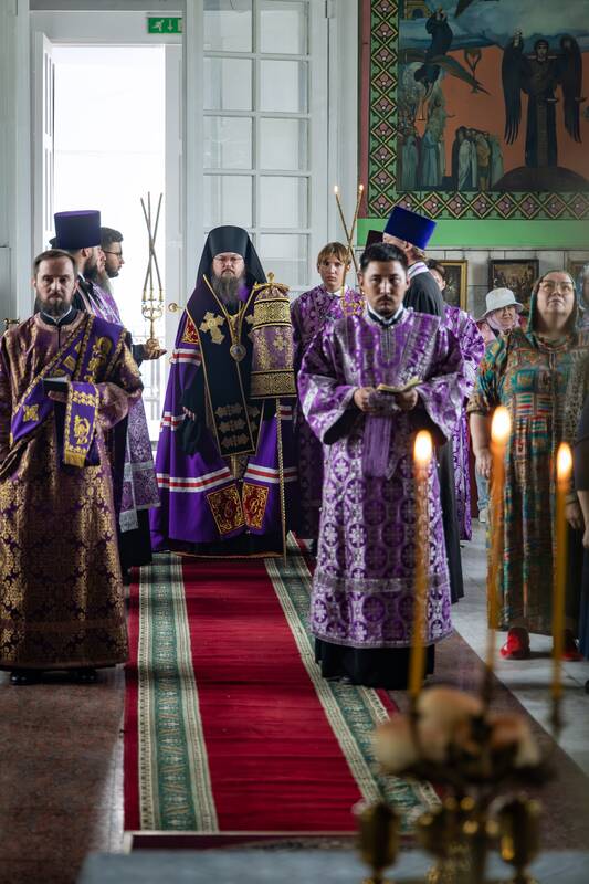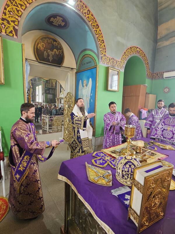 Его Преосвященству сослужили: ключарь Свято-Успенского кафедрального собора г.Атырау, иеромонах Варфоломей (Мостовщиков), клирик Благовещенского храма г.Актау, иерей Михаил Соколов, клирик кафедрального собора Михаила Архангела г.Уральска, иерей Андрей Александров, клирик кафедрального Свято-Успенского кафедрального собора г.Атырау, иерей Александр Ермаков, клирик кафедрального собора Михаила Архангела г.Уральска, иеродиакон Арсений (Рыбальченко), клирик кафедрального Свято-Успенского собора г.Атырау, диакон Богдан Муликов.