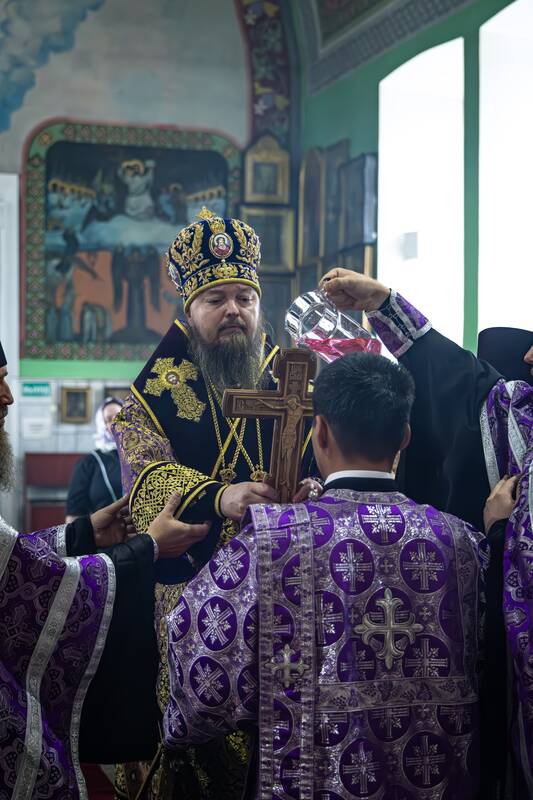 После великого славословия епископ Вианор совершил чин Воздвижения Креста.