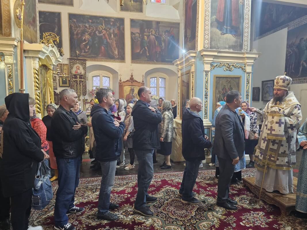 Его Преосвященству сослужили: клирики Покровского женского монастыря г.Уральска архимандрит Дионисий (Козулев), игумен Дорофей (Дильманаев), иерей Андрей Морозкин, ключарь кафедрального собора Михаила Архангела г.Уральска, протоиерей Георгий Лемачко, клирик кафедрального собора Михаила Архангела г.Уральска, диакон Владимир Лемачко.