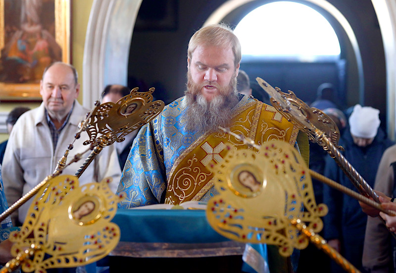 На Литургии было прочитано Богородичное Евангелие от Луки 54 Зачало: В продолжение пути их пришел Он в одно селение; здесь женщина, именем Марфа, приняла Его в дом свой; у нее была сестра, именем Мария, которая села у ног Иисуса и слушала слово Его. Марфа же заботилась о большом угощении и, подойдя, сказала: Господи! или Тебе нужды нет, что сестра моя одну меня оставила служить? скажи ей, чтобы помогла мне. Иисус же сказал ей в ответ: Марфа! Марфа! ты заботишься и суетишься о многом, а одно только нужно; Мария же избрала благую часть, которая не отнимется у нее. Когда же Он говорил это, одна женщина, возвысив голос из народа, сказала Ему: блаженно чрево, носившее Тебя, и сосцы, Тебя питавшие! А Он сказал: блаженны слышащие слово Божие и соблюдающие его. (Лк. 10, 38–42; 11, 27–28)