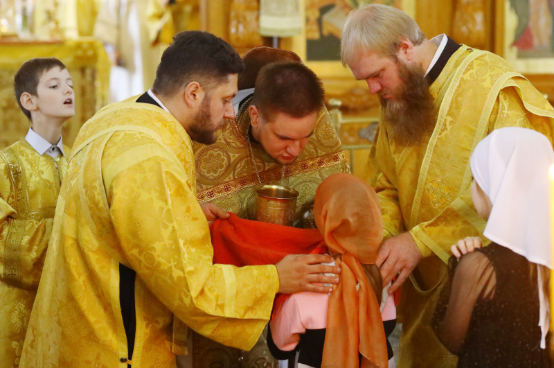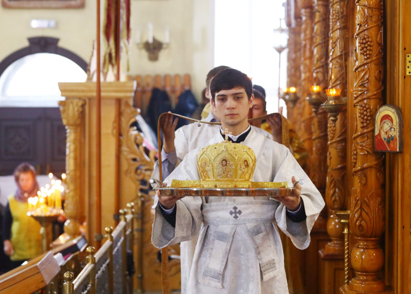 На Литургии было прочитано Евангельское Зачало 30 от Луки: После сего Иисус пошел в город, называемый Наин; и с Ним шли многие из учеников Его и множество народа. Когда же Он приблизился к городским воротам, тут выносили умершего, единственного сына у матери, а она была вдова; и много народа шло с нею из города. Увидев ее, Господь сжалился над нею и сказал ей: не плачь. И, подойдя, прикоснулся к одру; несшие остановились, и Он сказал: юноша! тебе говорю, встань! Мертвый, поднявшись, сел и стал говорить; и отдал его Иисус матери его. И всех объял страх, и славили Бога, говоря: великий пророк восстал между нами, и Бог посетил народ Свой. (Лк. 7:11-16)