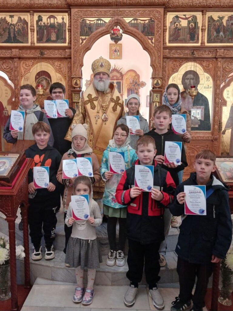 По окончании духовного наставления владыка отметил грамотами участников различных творческих и интеллектуальных конкурсов, прошедших в текущем году по благословению митрополита Астанайского и Казахстанского Александра.
