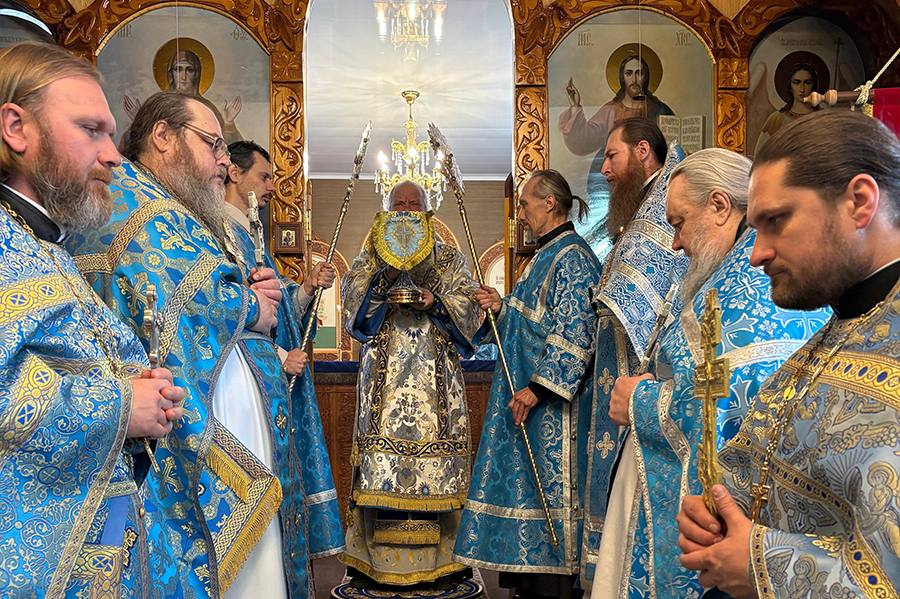 После заамвонной молитвы состоялось славление Божией Матери перед Ее честной иконой. Далее был совершен крестный ход, на котором архиепископ Севастиан окропил всех святой водой. В завершение богослужения правящий архиерей произнес проповедь, поздравил настоятеля и прихожан с престольным праздником и преподал всем Божие благословение.