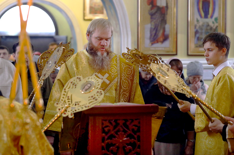 На Литургии было прочитано Воскресное Евангельское Зачало 38 от Луки: И приплыли в страну Гадаринскую, лежащую против Галилеи. Когда же вышел Он на берег, встретил Его один человек из города, одержимый бесами с давнего времени, и в одежду не одевавшийся, и живший не в доме, а в гробах. Он, увидев Иисуса, вскричал, пал пред Ним и громким голосом сказал: что Тебе до меня, Иисус, Сын Бога Всевышнего? умоляю Тебя, не мучь меня. Ибо Иисус повелел нечистому духу выйти из сего человека, потому что он долгое время мучил его, так что его связывали цепями и узами, сберегая его; но он разрывал узы и был гоним бесом в пустыни.