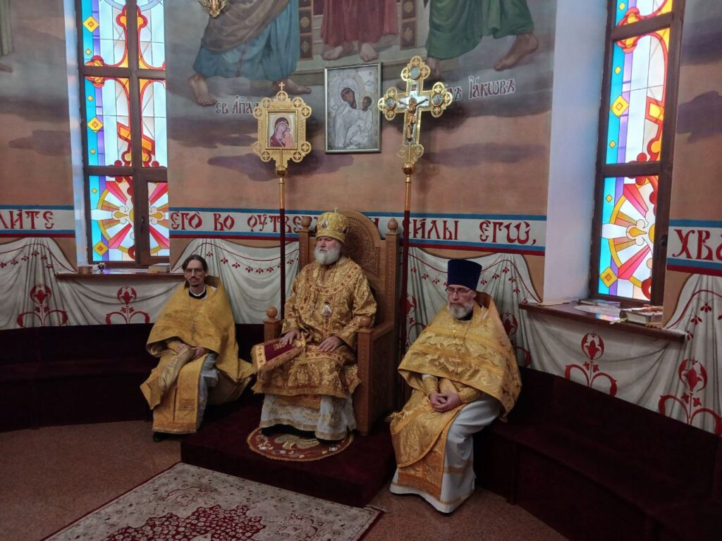 Преосвященному владыке сослужили: ключарь собора иерей Леонид Худяков, руководитель епархиального отдела по социальной работе иерей Роман Сайтиев, секретарь епархии иерей Борис Фатеев, ответственный за работу паломнического отдела епархии диакон Сергий Мешков.
