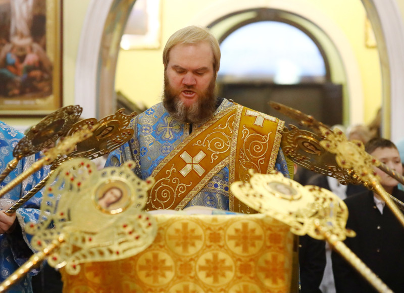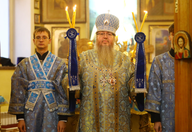 На службе было прочитано Богородичное Евангельское зачало 54 от Луки: Во вре́мя о́но, вни́де Иису́с в весь не́кую, жена́ же не́кая и́менем Ма́рфа прия́т Его́ в дом свой. И сестра́ ей бе нарица́емая Мари́а, я́же и се́дши при ногу́ Иису́сову, слы́шаше сло́во Его́. Ма́рфа же мо́лвяше о мно́зе слу́жбе, ста́вши же рече́: Го́споди, не бреже́ши ли, я́ко сестра́ моя́ еди́ну мя оста́ви служи́ти; рцы у́бо ей, да ми помо́жет. Отвеща́в же Иису́с, рече́ ей: Ма́рфо, Ма́рфо, пече́шися и мо́лвиши о мно́зе. Еди́но же есть на потре́бу. Мари́а же благу́ю часть избра́, я́же не оты́мется от нея́. Бысть же егда́ глаго́лаше сия́, воздви́гши не́кая жена́ глас от наро́да, рече́ Ему́: блаже́но чре́во носи́вшее Тя, и сосца́, имиже питался еси. Он же рече́: те́мже у́бо блаже́ни слы́шащии сло́во Бо́жие, и храня́ще е́. (Лк. 10:38–42; 11:27–28)