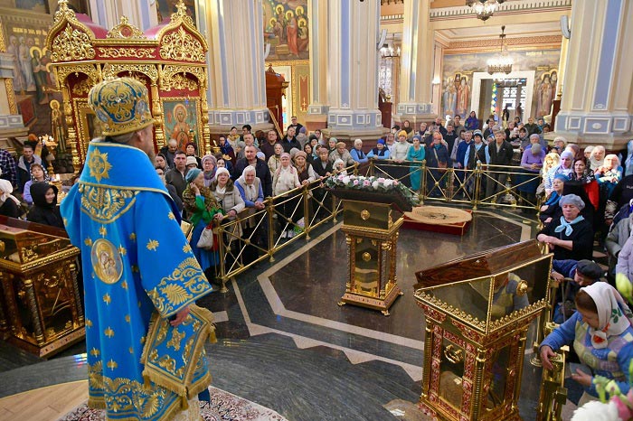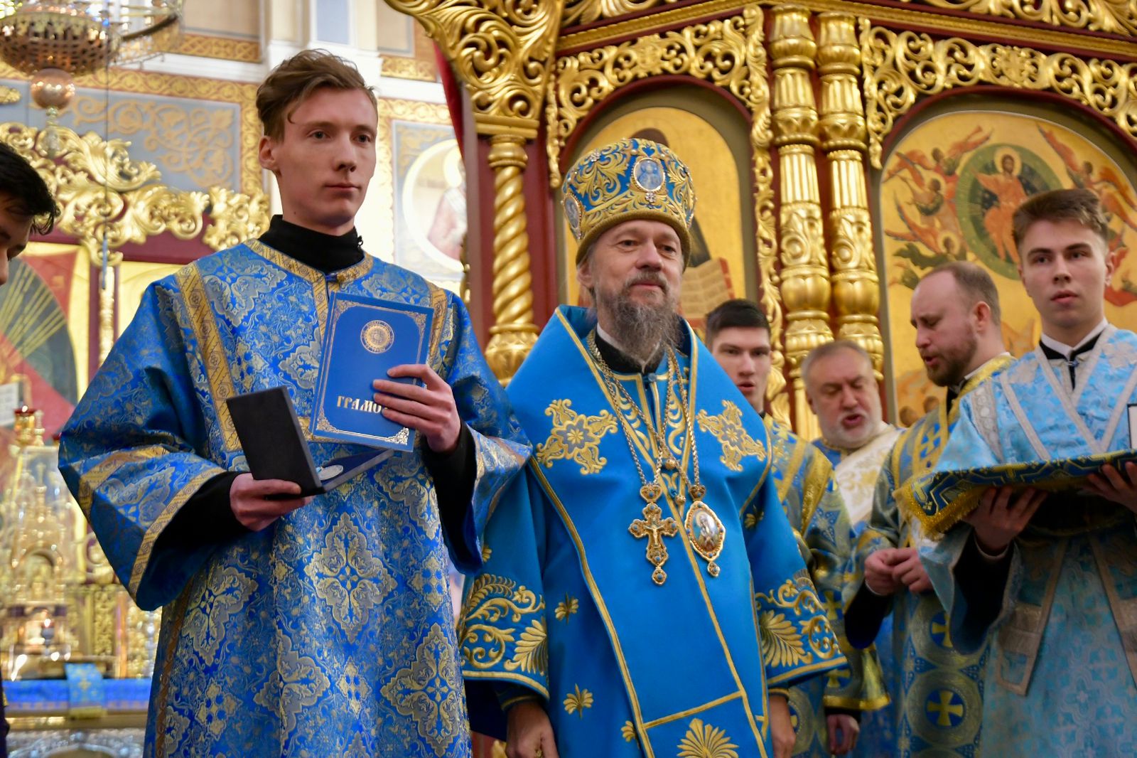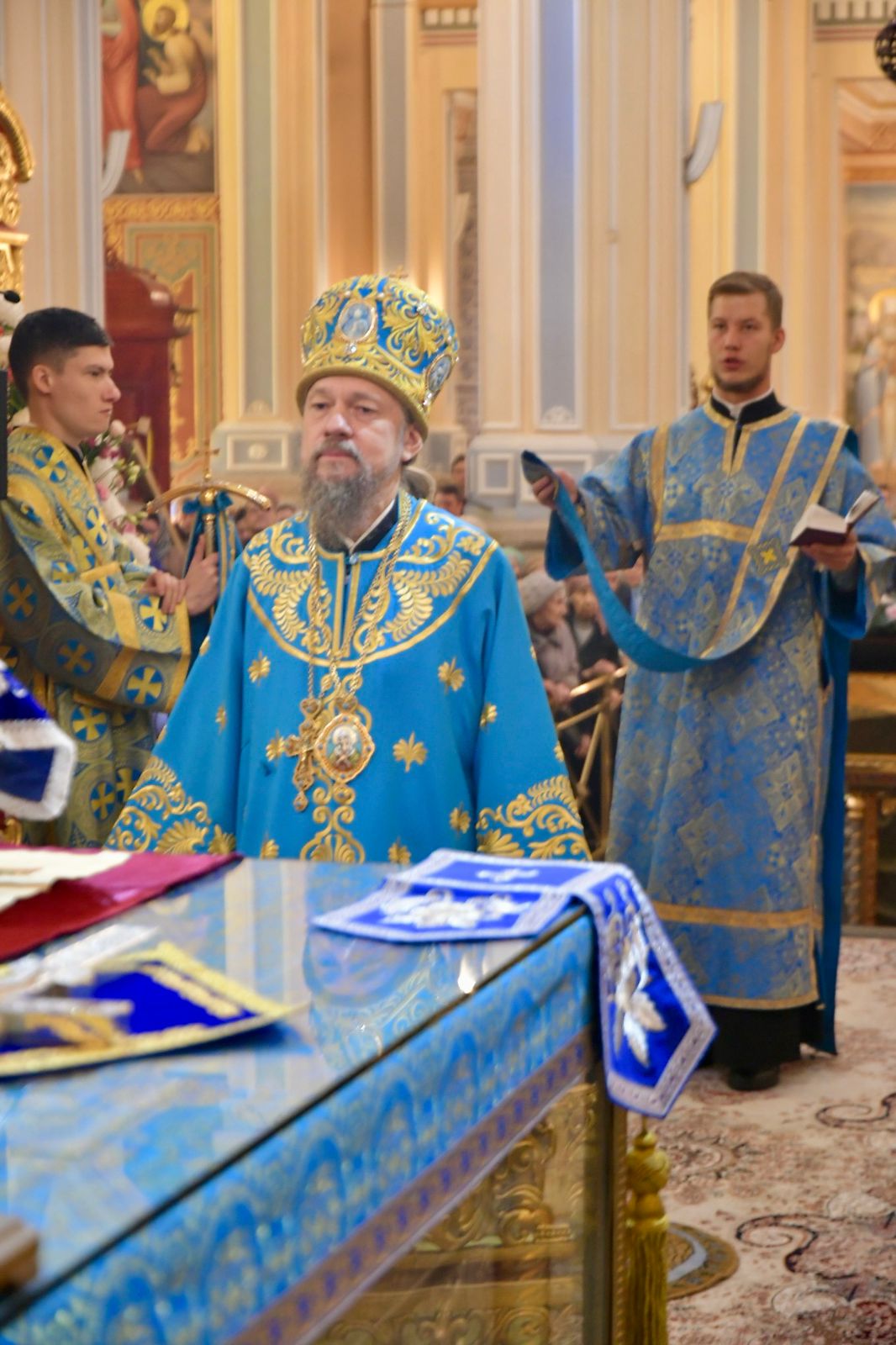 Литургия завершилась славлением празднику: хор и духовенство исполнили тропарь и кондак Введения во храм Пресвятой Богородицы.