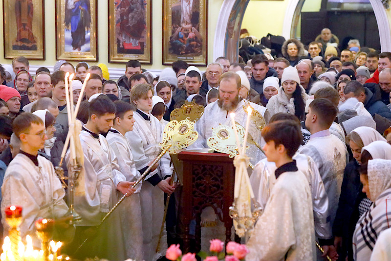 На Литургии было прочитано Евангельское Зачало от Матфея: Когда же Иисус родился в Вифлееме Иудейском во дни Ирода царя, вот, волхвы с востока прибыли в Иерусалим и сказали: где родившийся Царь Иудейский? Ибо мы видели восход Его звезды и пришли поклониться Ему. Услышав это, царь Ирод смутился, и весь Иерусалим с ним. И собрав всех первосвященников и книжников народных, спрашивал у них: где родится Христос? Они же сказали ему: в Вифлееме Иудейском, ибо так написано чрез пророка: «И ты, Вифлеем, земля Иудина, ничем не меньше правителей Иудиных; ибо из тебя выйдет Вождь, Который будет пасти народ Мой, Израиля».