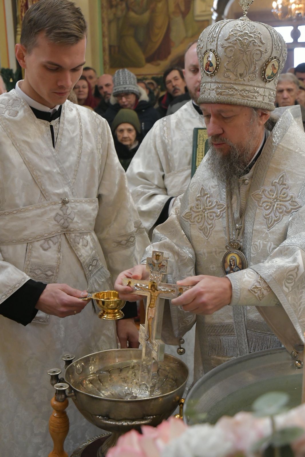 После окропления великой агиасмой храма и молящихся, духовенство и певчие исполнили тропарь и кондак праздника перед иконой Крещения.