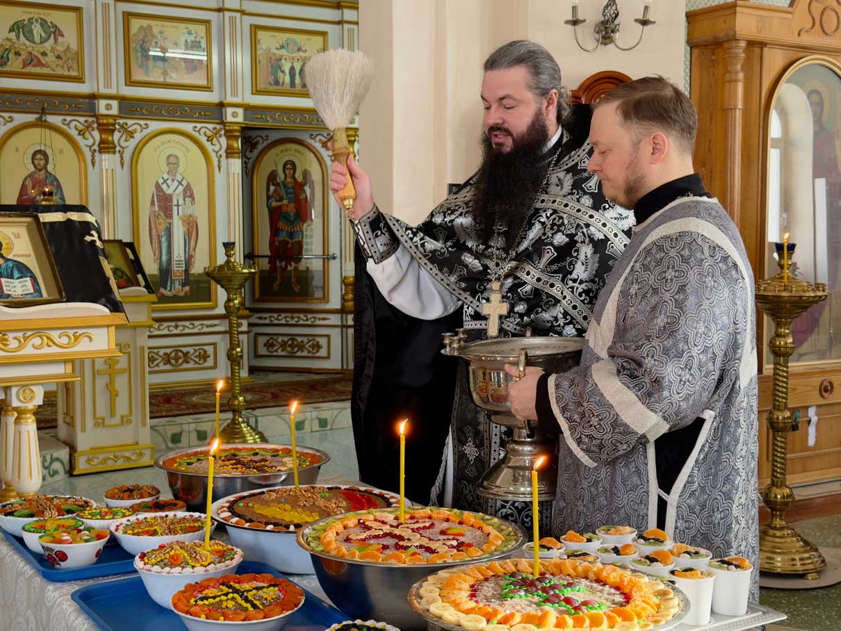По заамвонной молитве было совершено молебное пение святому великомученику Феодору Тирону и освящение колива.