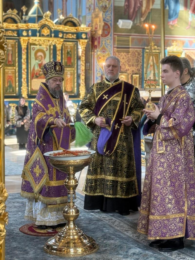 По заамвонной молитве Владыка Геннадий с сослужащим духовенством совершил уставное молебное пение великомученику Феодору Тирону с чином освящением колива.