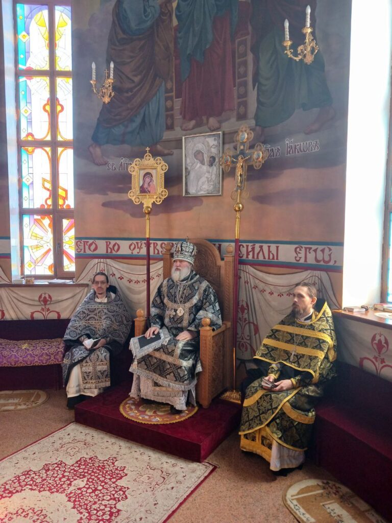 Преосвященному владыке сослужили: ключарь собора иерей Леонид Худяков, иерей Роман Сайтиев, секретарь епархии иерей Борис Фатеев, диакон Сергий Мешков.